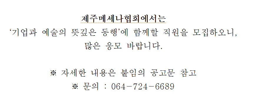 사단법인 제주메세나협회 주소 : 제주특별자치도 제주시 청사로1길 18-4, 1층 고유번호 : 232-82-00336 Tel. 064-724-6689 Fax. 070-8900-6680