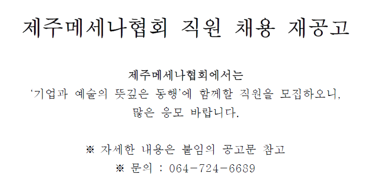 사단법인 제주메세나협회 주소 : 제주특별자치도 제주시 청사로1길 18-4, 1층 고유번호 : 232-82-00336 Tel. 064-724-6689 Fax. 070-8900-6680