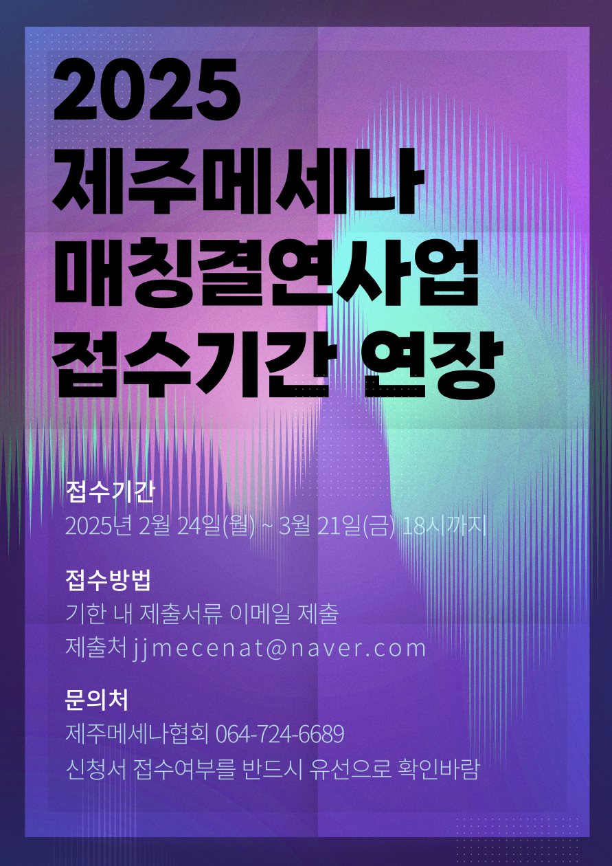 사단법인 제주메세나협회 주소 : 제주특별자치도 제주시 청사로1길 18-4, 1층 고유번호 : 232-82-00336 Tel. 064-724-6689 Fax. 070-8900-6680