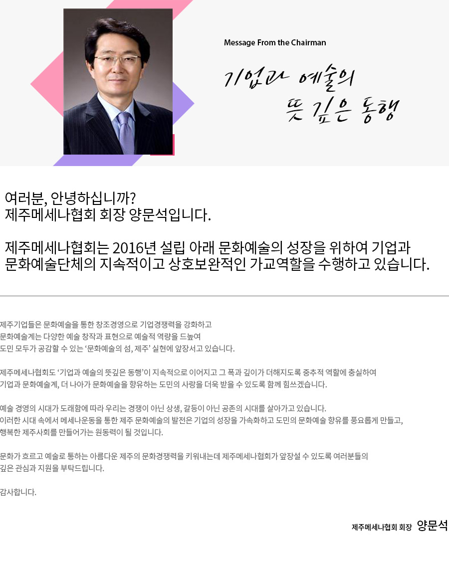 사단법인 제주메세나협회 주소 : 제주특별자치도 제주시 청사로1길 18-4, 1층 고유번호 : 232-82-00336 Tel. 064-724-6689 Fax. 070-8900-6680
