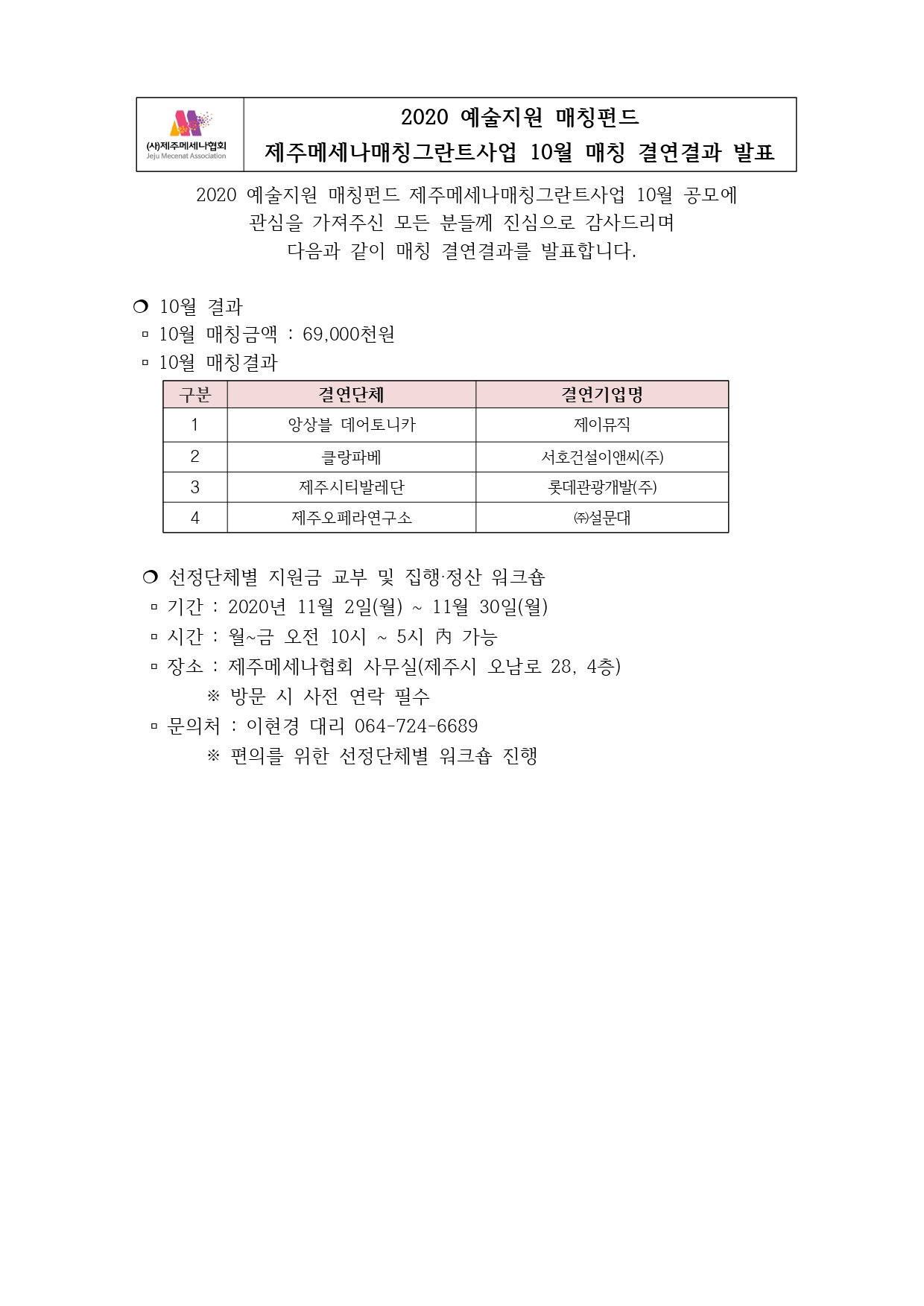 2020 예술지원매칭펀드 제주메세나매칭그란트사업 10월 매칭결연 결과 2020.11.02 | 메세나협회