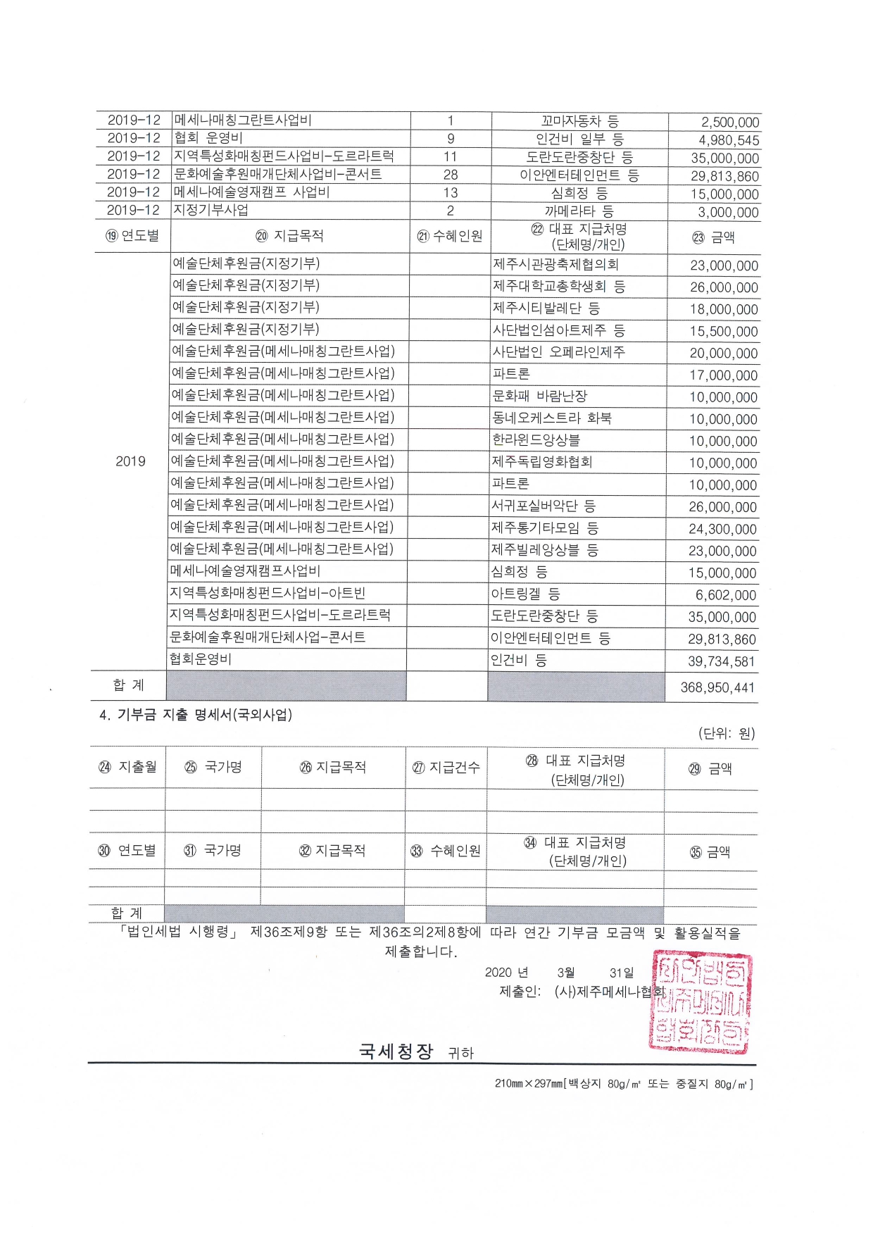 2019 연간 기부금 모금액 및 활용실적 명세서 2020.03.31 | 메세나협회